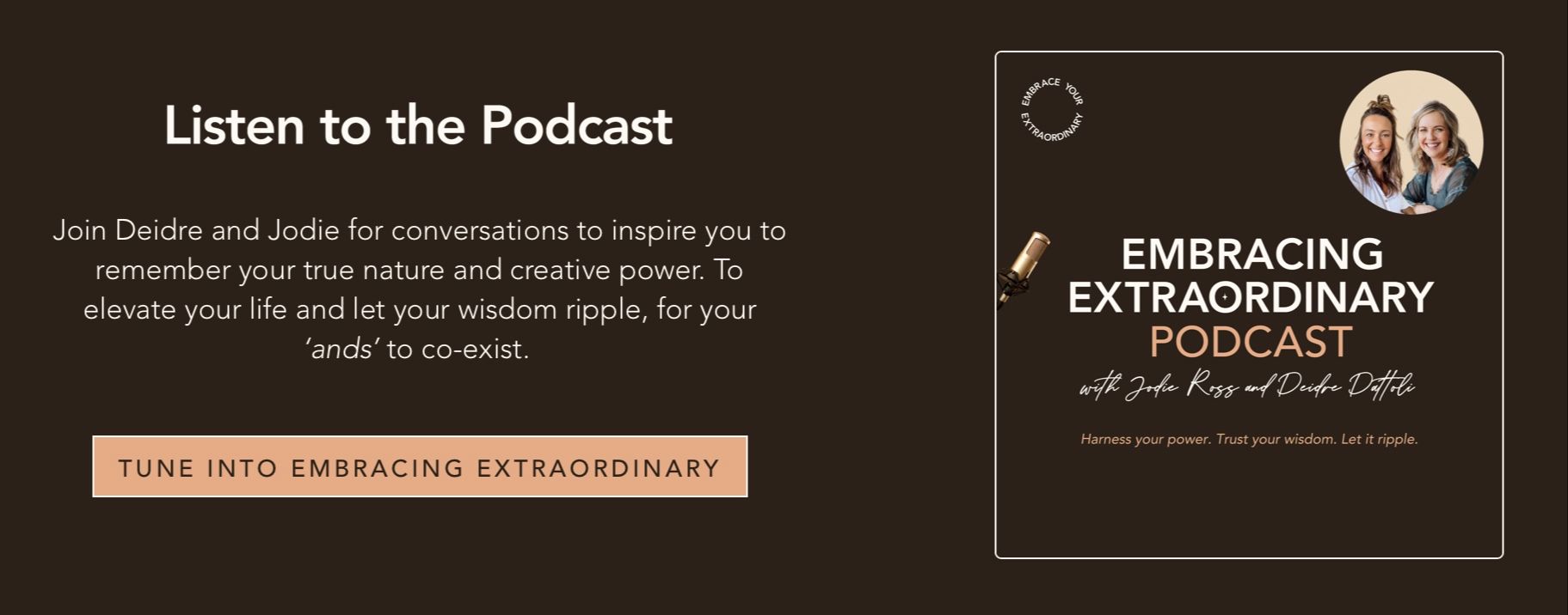 Elevated results donât come from trying harder. They come from the state youâre creating from. The missing piece to optimise how good your results and life can be is alignment and creating from more of who you naturally are: an extraordinary multi-faceted human with many parts and incredible creative power. We are Deidre Dattoli and Jodie Ross. We have a knack for making the complex stuff tangible, and we teach you how to work with your whole system that's both physical and non-physical. To help you heal, update and rewire, access available potential, and naturally elevate how you function and what you experience in your life.Â